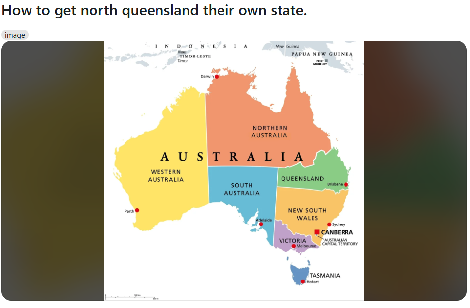 有人在Reddit上发布了一篇名为“如何让北昆士兰成为独立的州”的帖子,还分享了一张非官方地图。