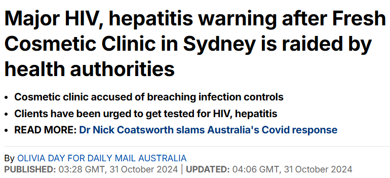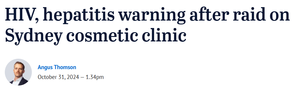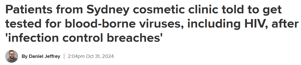 就在上个月,位于Macquarie St的一家诊所有患者在接受治疗后感染了乙型肝炎,于是报告给卫生部门,该部门随即展开突击检查。