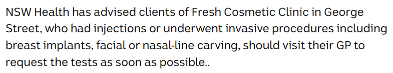 任何在该诊所接受过注射或接受侵入性手术(如乳房植入物、面部或鼻线雕刻)的客户应尽快去看他们的全科医生接受检测。