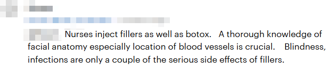 “护士不仅注射肉毒杆菌,还注射填充物。对面部解剖,尤其是血管位置的深入了解至关重要。失明、感染只是填充物的一些严重副作用。”