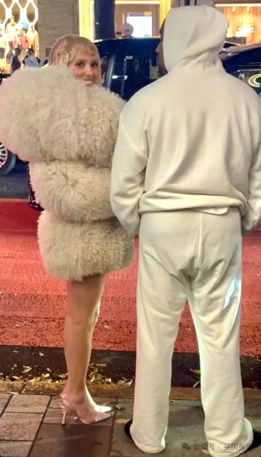她上身穿一件长至大腿处、毛茸茸的奶油色大衣,头顶一盏金色的卷毛短发,脚上依旧是尖头高跟鞋。