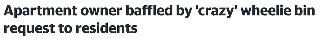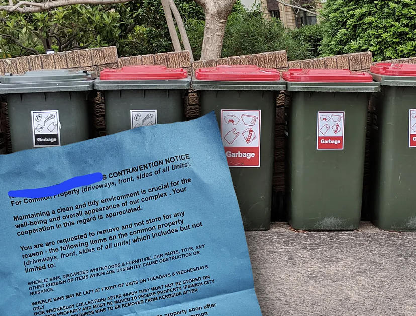 近日,昆州某地的公寓住户收到了Strata的一份通知,其中包含了一条让人难以理解的关于垃圾桶的要求。