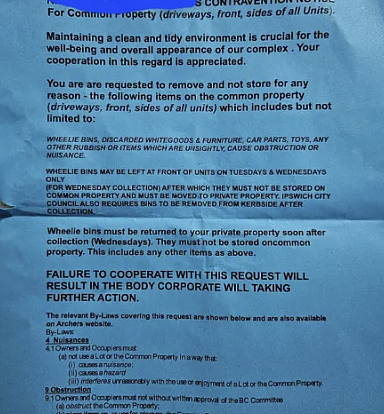 Strata表示,垃圾桶被认为不美观,可能会在车库及建筑物的前面和侧面等公共区域造成障碍,因此,通知要求所有垃圾桶应“移到私人区域”。