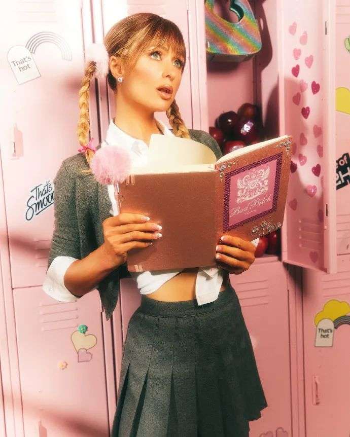 被模仿的希尔顿,自己则重温了小甜甜布兰妮千禧年神曲《baby one more time》的MV造型。