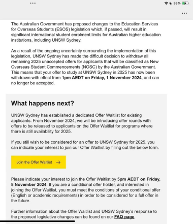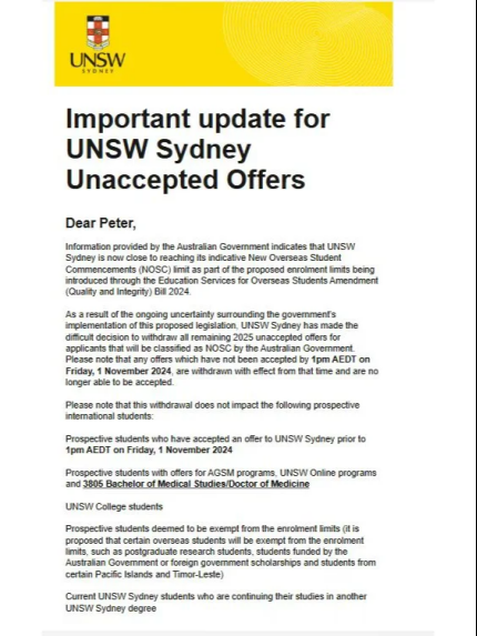 从昨天下午,也就是2024年11月1日澳洲东部夏令时间下午1点开始,UNSW陆续撤回所有未接受的offer。