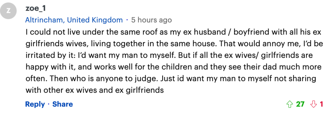 “我不能和我的前夫/前男友以及他所有前女友、前妻住在同一屋檐下,同一所房子里。那会让我烦恼,我会为此感到恼火:我希望我的男人只属于我自己。