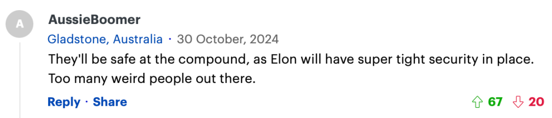 “他们在院子里会很安全,因为Elon会有非常严密的安全措施。外面有太多奇怪的人了。”