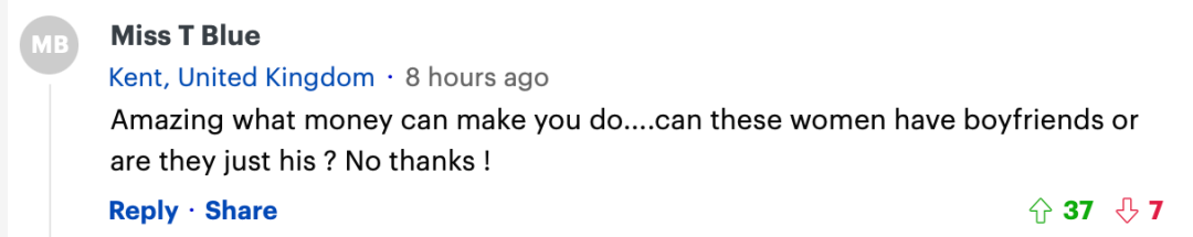 “金钱能让你做的事情真是令人惊讶……这些女性有男朋友吗,还是她们只是他的?不,谢谢!”