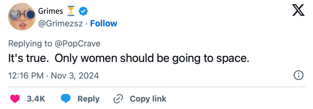 而曾有个最可能上太空的前男友的格林姆斯对这个视频回复到:“是真的,只有女性才应该去太空。”