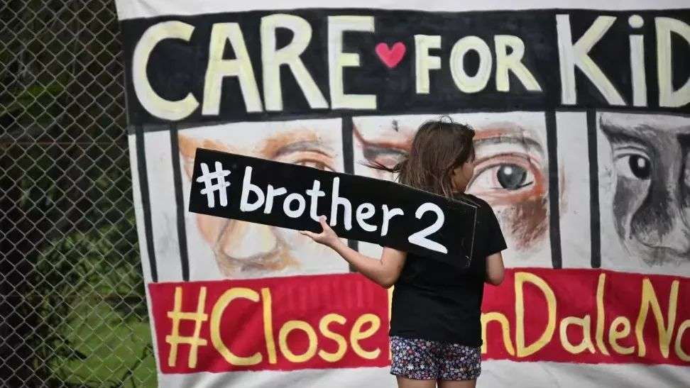 一名抗议者举着牌子,上面写着:“10岁的孩子还长着乳牙。”
