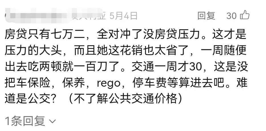 房贷只有七万二,全对冲了没房贷压力。这才是压力的大头,而且她这花销也太省了,一周随便出去吃两顿就一百刀了。交通一周才30,这是没把车保险,保养,rego,停车费等算进去吧。难道是公交?(不了解公共交通价格)。