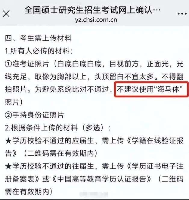 另有网友表示,在高考报名、办理出入境证件时,也被提示慎用“海马体”或经过其他美颜工具P图的照片,在审核质检环节不能通过会被回退。