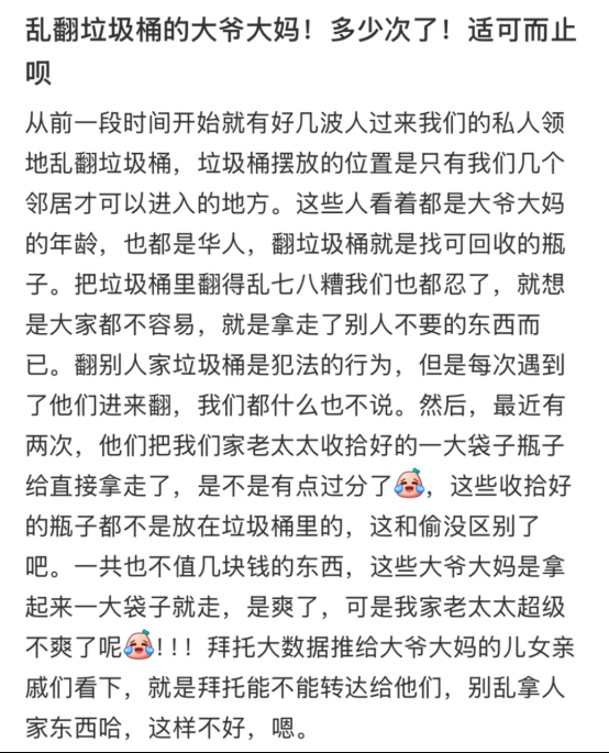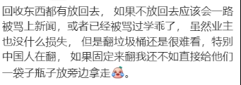 随后博主表示是翻垃圾桶的似乎是中国人,虽说东西都有放回去,但是翻垃圾桶还是很难看,不理解他们的行为,但也好心表示,如果他们还定期来翻的话,还不如自己将瓶子收集好放旁边给她带走。