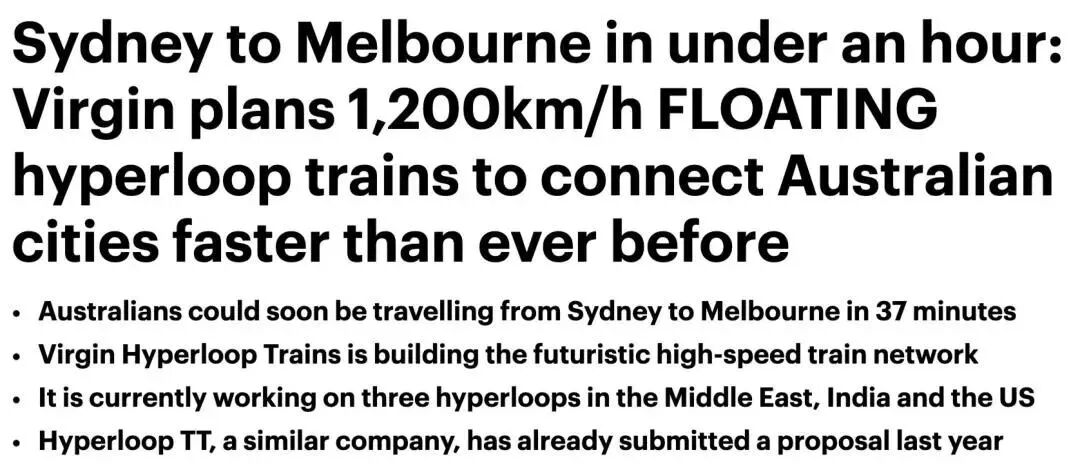 近几年,关于高铁的讨论越来越多,技术发展也突飞猛进。在时任新州州长Gladys Berejiklian的大力推动下,2019年,维珍集团旗下的Hyperloop One向澳大利亚提交了一项高铁方案,计划采用全球最先进的悬浮列车技术,将列车时速提升至1200公里/小时,几乎是目前世界上运行速度最快的高铁的三倍,并且作为领跑全球的中国高铁时速也仅为350公里/小时!
