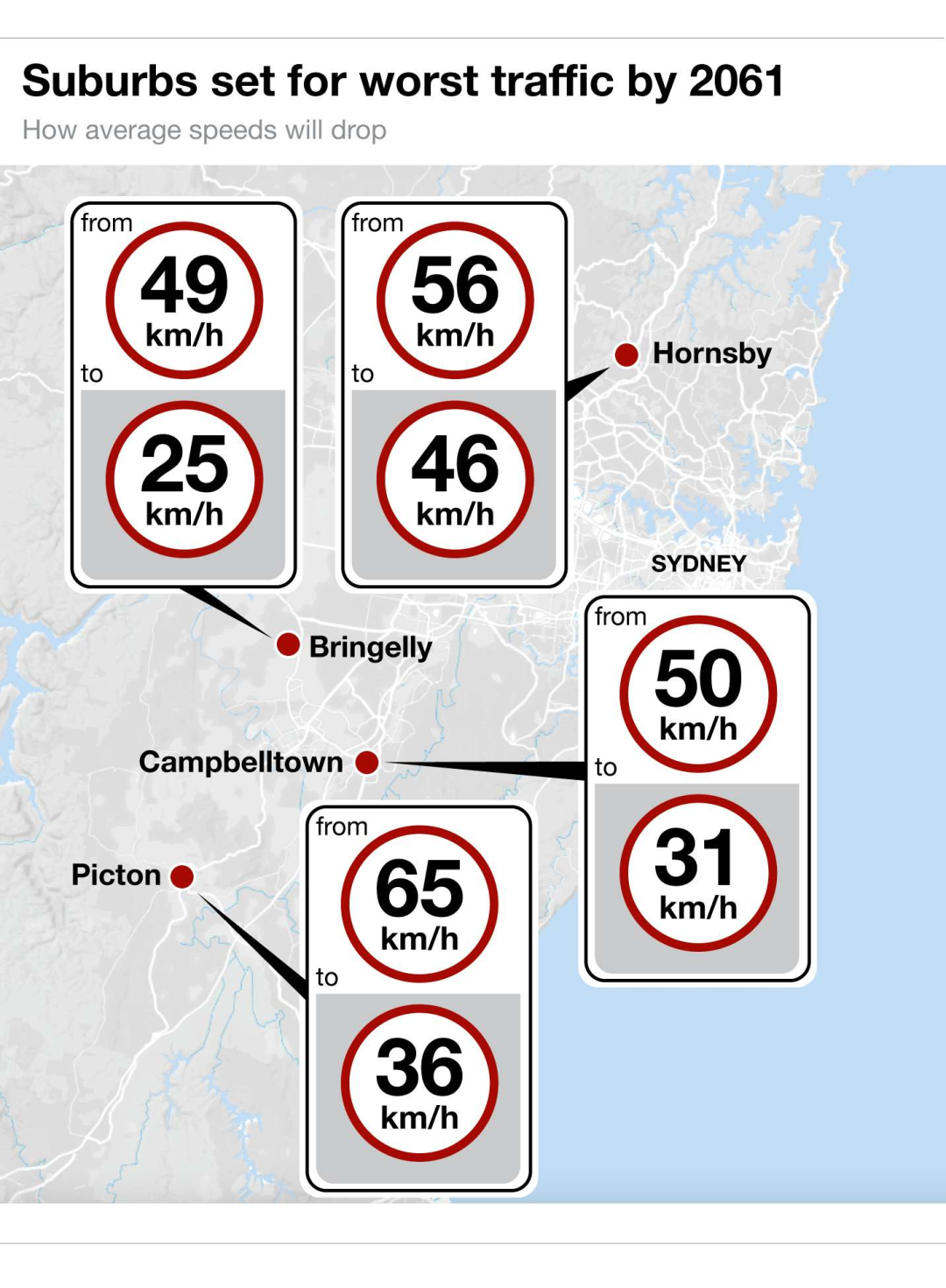 除了受交通拥堵影响最严重的是悉尼西南部的增长地区,但到2061年,即使是来自Hornsby等地的司机也将面临恶化的驾驶条件。