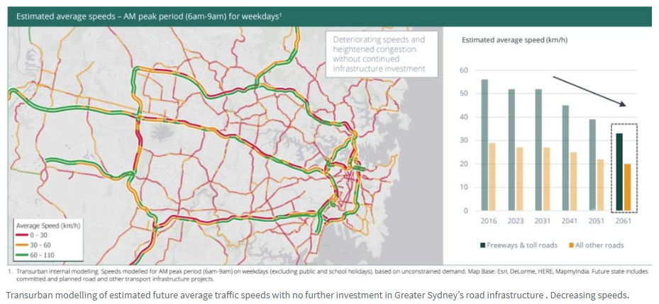 模型显示,到2035年,大悉尼地区的交通量将激增14%。如果道路网络保持不变,行驶速度将大幅下降。预计除收费路和高速路外,大多数道路的平均行驶速度将降至每小时26公里,而到2061年,这一速度将低于每小时20公里!
