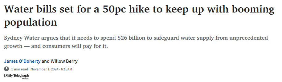 Sydney Water在提交给IPART的报告中声称,这是为了筹集资金以跟上相当于堪培拉面积地区发展的增长需求。