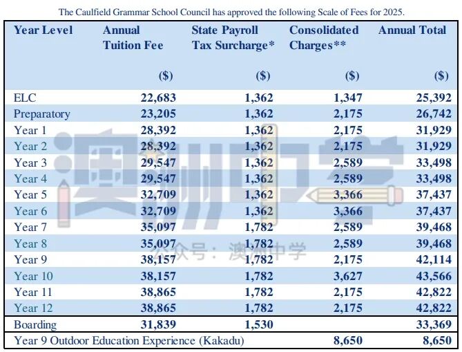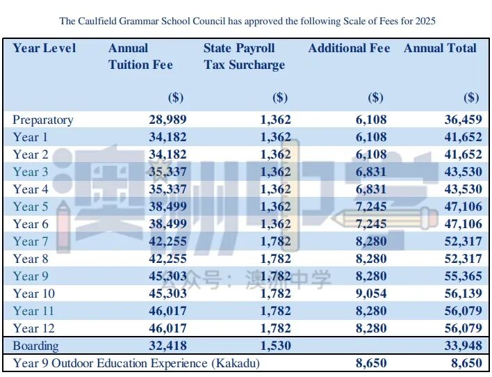 Caulfield Grammar 明年将面临 650 万澳元的工资税账单。除了学费和综合费用外,学校还为小学生增加了 1362 澳元的附加费,为中学生增加了 1782 澳元的附加费。