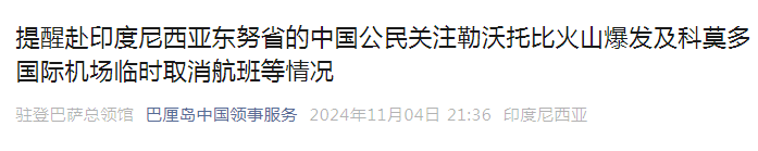 因为火山喷发,中国登巴萨总领馆也紧急发布声明: