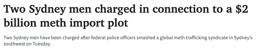 与此同时,随着澳洲毒品交易利润的攀升,大量毒品(特别是甲基苯丙胺,即冰毒)通过悉尼机场以及港口等地被非法走私入境。