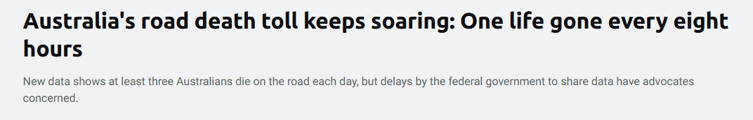 根据澳洲汽车协会的相关统计数据显示:平均每8小时,澳洲就有1人死于交通事故!