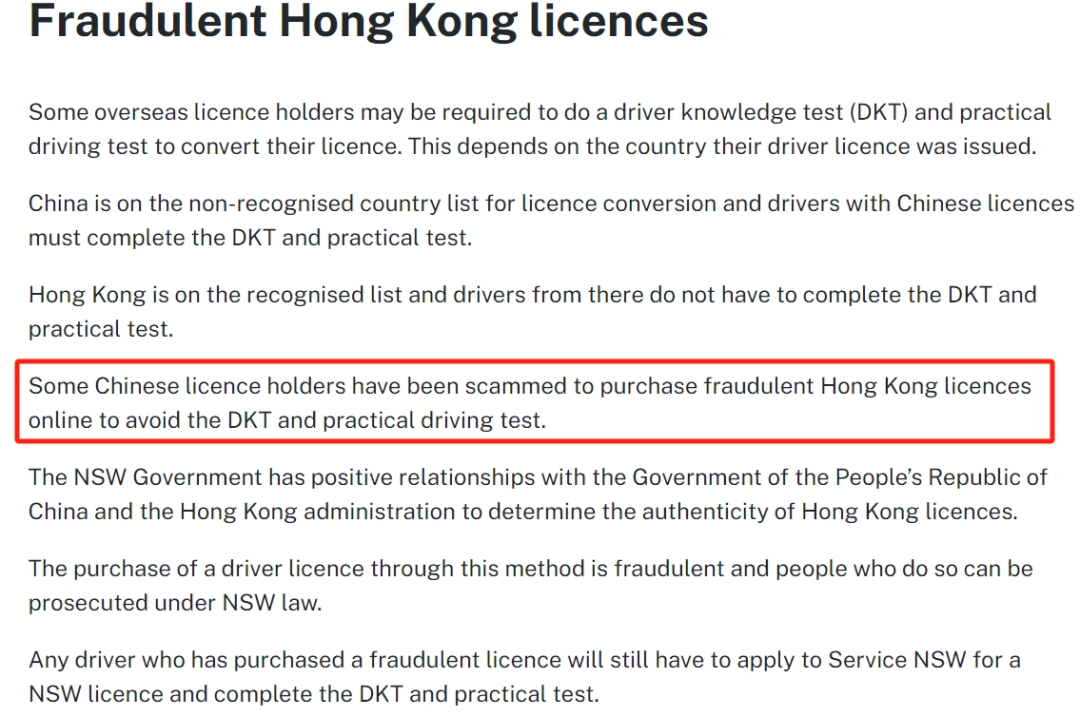 新州政府特意点名,表示在此之前有些中国驾照持有者被骗,在网上购买了伪造的香港驾照,就为了逃避知识测试以及实践考试。其表示通过这种方法购买驾照属于违法行为,一旦被发现将依据维州法律进行起诉。