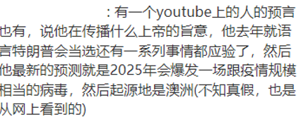 据说他去年就预言特朗普当选,后面一系列事件都应验了,最新的预测就是2025年会爆发一场大规模的病毒,起源地就是澳洲。