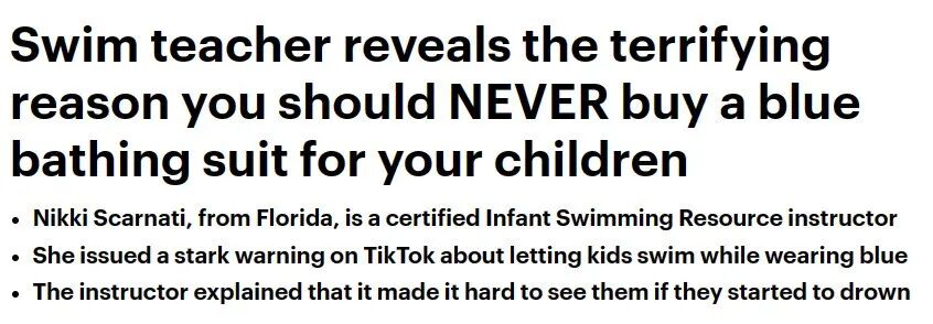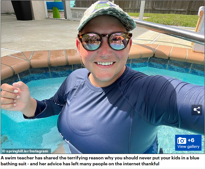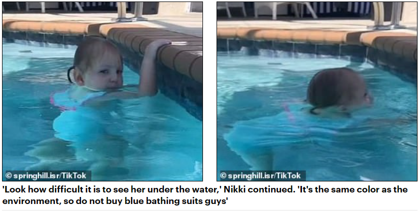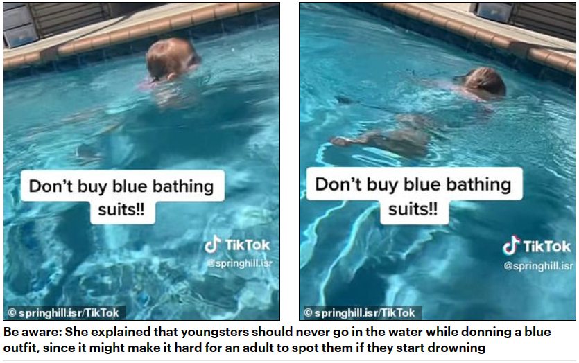 据Scarnati教练近日在TikTok上分享的一段视频表示,孩子穿蓝色泳衣看似无害,但实际上会让你的孩子处于严重的危险之中。