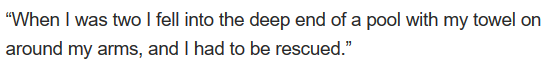 还有网友说:“我两岁的时候,我就在胳膊被毛巾裹住的情况下掉进了游泳池的深处,最后只能等别人将我救起来。”