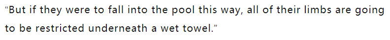 另一位家长说:“我的孩子在泳池边上绊倒了,因为她裹着毛巾,没法动弹,下巴摔裂了。”