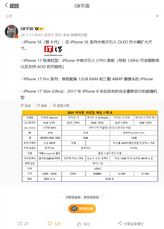 甚至 @i冰宇宙 还分享了 iPhone 17 系列的信息表,显示会新增 Slim 机型,号称是“2017 年 iPhone 8 年后发布的完全重新设计的超薄机型”。