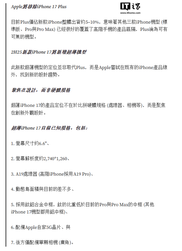 所以,据多个消息源透露,在 iPhone 17 中,苹果要砍掉 Plus 机型,取而代之的是一款超薄机型。
