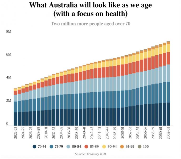 虚弱的老年将成为社会的常见特征。根据2021年人口普查,30岁的人中有六分之一有长期健康问题,而80岁以上的三分之一的人有健康问题,最常见的是关节炎、心脏病和糖尿病。孤独和抑郁也成为老年人失去配偶后的普遍问题。此外,越来越多的澳大利亚人选择居家护理,而不是入住养老院,预计未来20年这一数字将翻倍,达到200万人,这也将改变该行业的资金和劳动力需求。