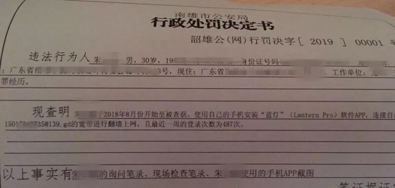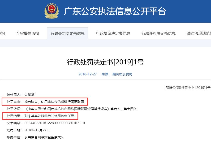 其实,早在2018年年底,微博上就有个新闻引发了网友们的激烈讨论,广东一名网友朱某,因为“擅自建立、使用非法定信道进行国际联网”,而被处以1000元的罚款。