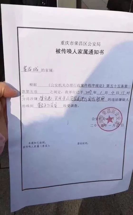 一份来自印有重庆市荣昌区公安局公章的,《被传唤人家属通知书》也在微博上曝光。