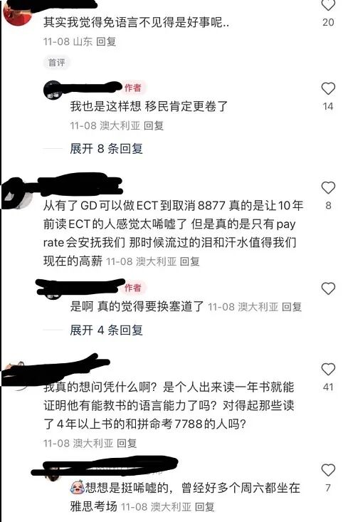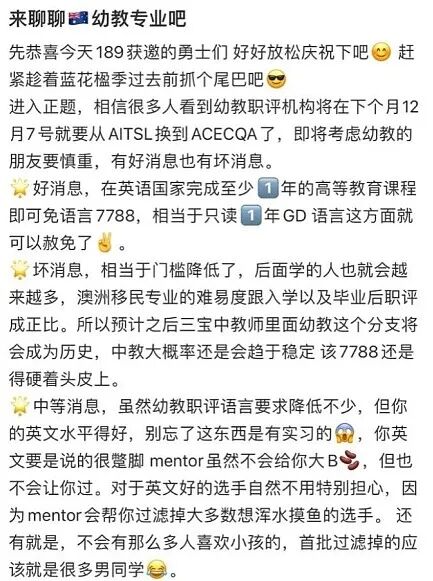 这大大降低了语言门槛,对于正在准备进入澳洲幼教领域的移民申请者来说,无疑是一个重要的调整,很多中国留学生在社交媒体对此进行讨论,有人认为这是利好消息,而另一部分人则表示,语言要求的降低势必导致申请人数的增加,那么获邀的分数也可能随之上涨。