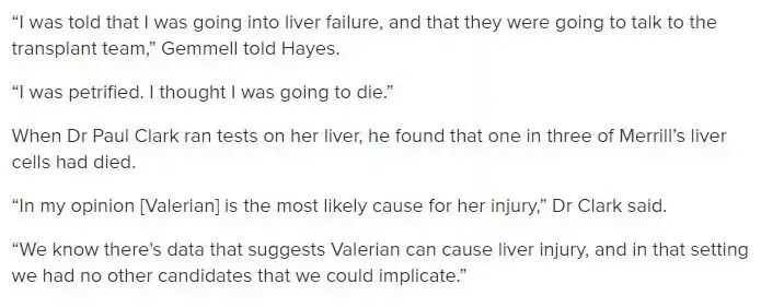 前往医院检查的时候,她被医生告知有1/3的肝脏已经坏死,她也第一次听到了缬草这种成分!