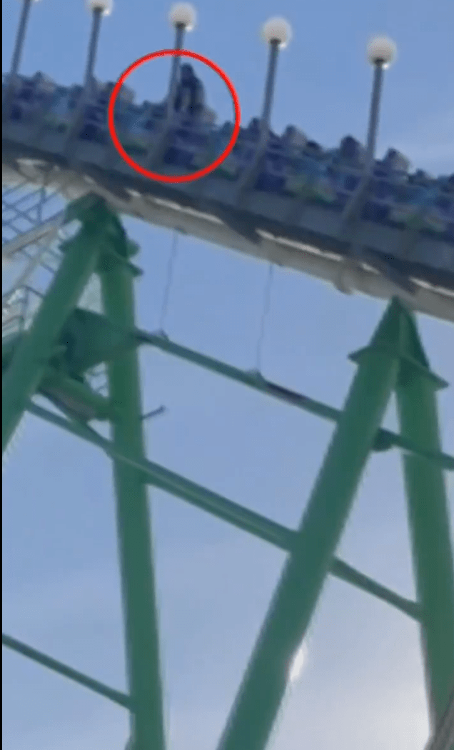 (视频可见,当时男子坐在双环过山车上,快爬升到顶点。男子发现安全杆松脱,决定跳车逃生)