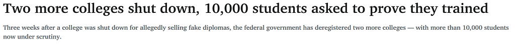 联邦政府设立针对培训学院的“举报”热线后,已有3所学院的注册资格被注销,近17000名学生的学历及资格证书可能存在问题。