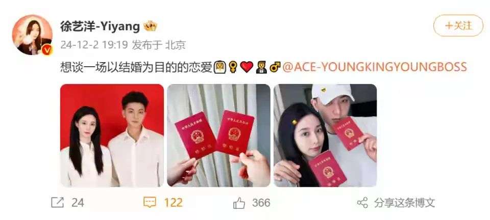 2024年12月2日 两人晒出结婚证,正式官宣结婚。