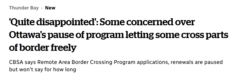 除此之外,加拿大边境服务局(CBSA)近期暂停了一项允许部分人员通过美加特定偏远地区自由通行计划的新申请和续签。