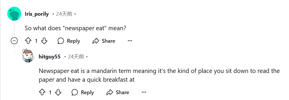 “Newspaper eat(报吃) ”是一个普通话词汇,意思是你可以坐下来看看报纸,吃点早餐。