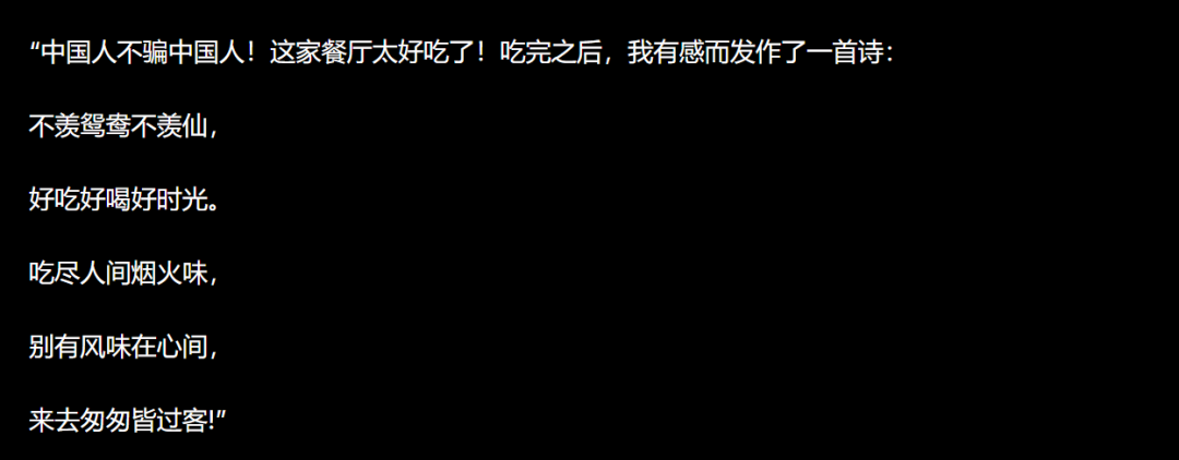 Chinese people don’t deceive each other! This restaurant is amazing! After eating here, I was so inspired that I wrote a poem: