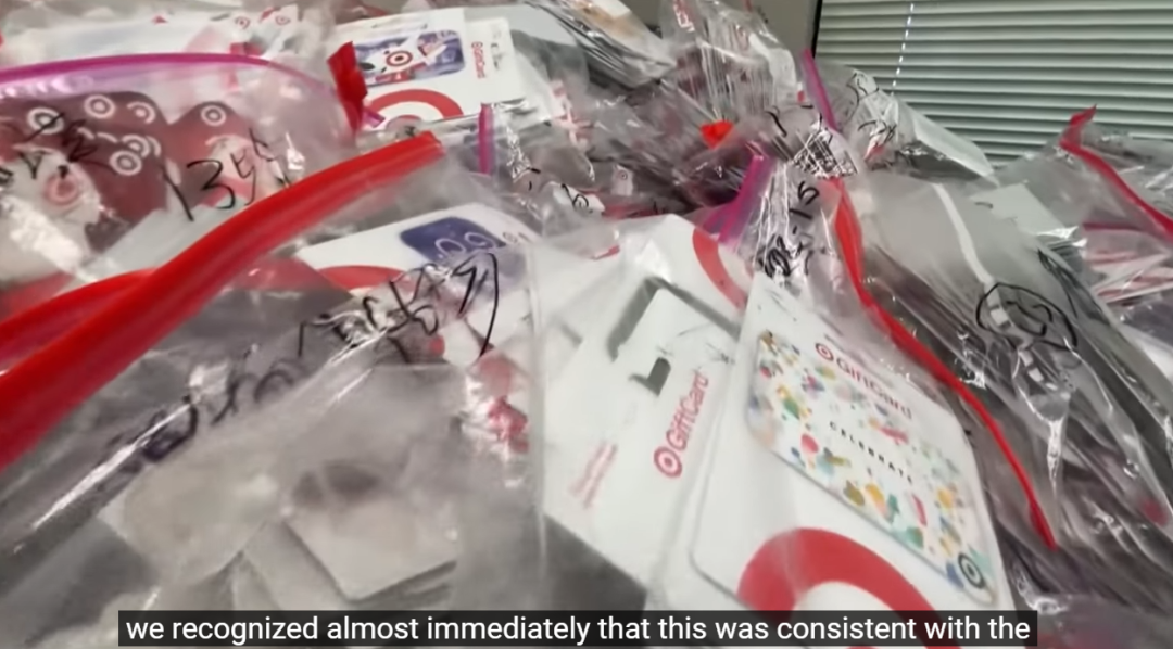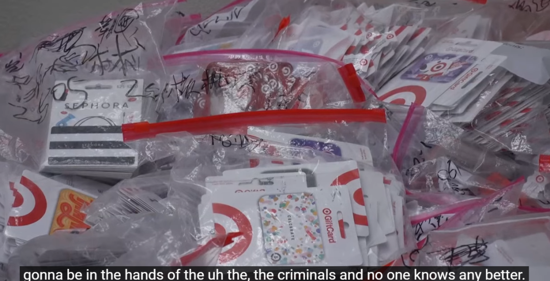 当警方打开后备箱时,眼前的景象令人震惊:堆积如山的礼品卡填满整个后备箱!卡片种类繁多,包括Target、Apple、Visa等多个品牌,许多礼品卡显然被篡改过。