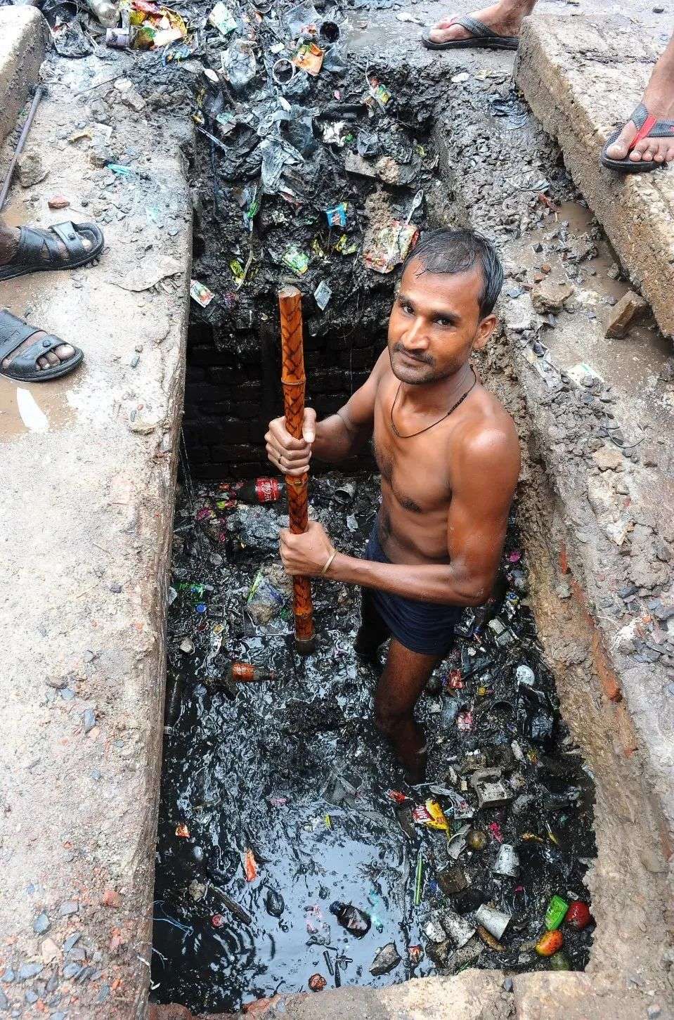 而清理工们几乎得不到任何防护措施,没有护目镜和口罩,也没有专业的防护服,就只能穿着单薄的裤子和鞋,或者干脆赤身浸入令人作呕的粪便和污水中工作。