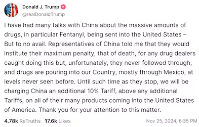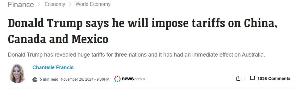 即将上任的美国总统特朗普已开始在幕后对关税问题发表言论,这是他“交易的艺术”式国际关系处理方式的一部分,先强硬出击,然后与被吓倒的对手进行谈判。