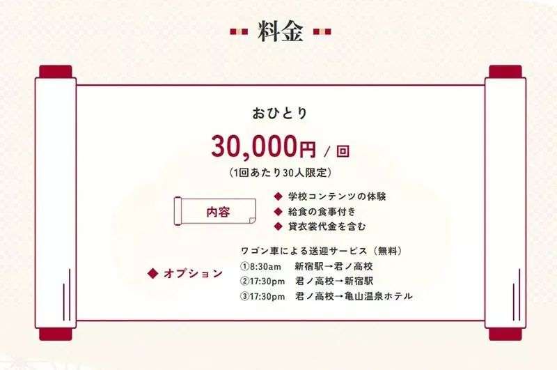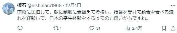 “前一天晚上先安排住宿,早晨换上校服,去学校,上课,吃校园午餐,这样体验日本学生的生活可能也不错。”