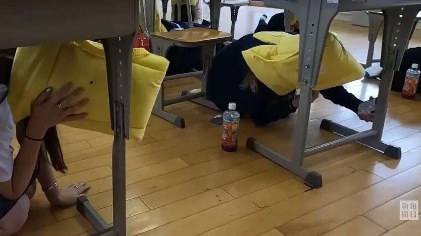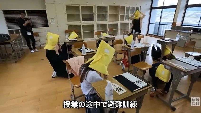 随着警报声突然响起,大家纷纷戴上防灾兜帽,快速钻到课桌底下。