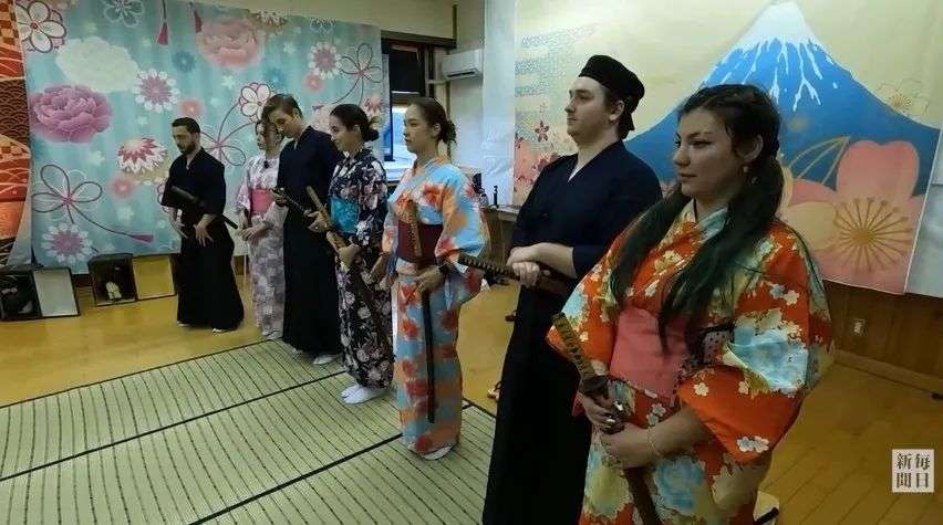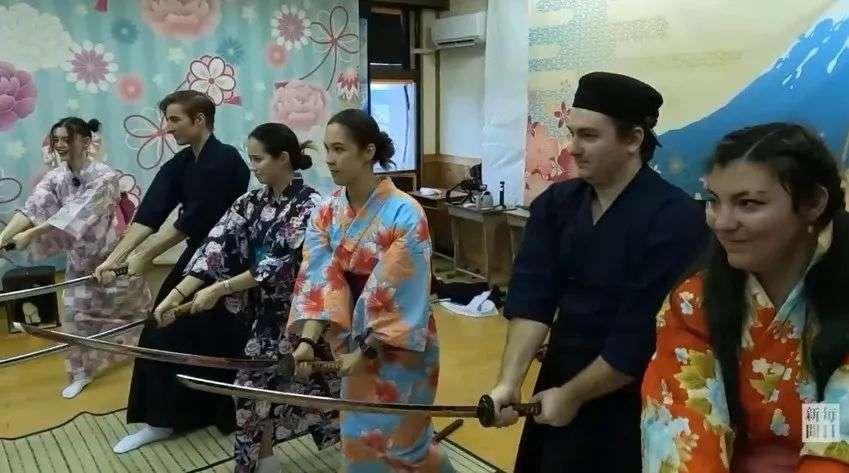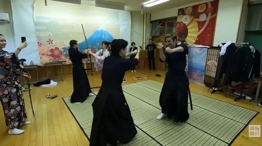 大家开始更换服装,拿起模造刀,一起进行训练,体验日本传统文化。