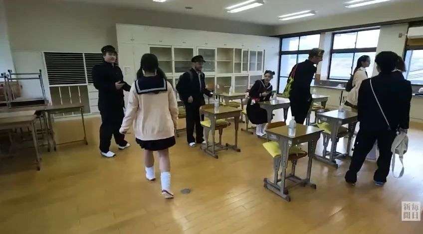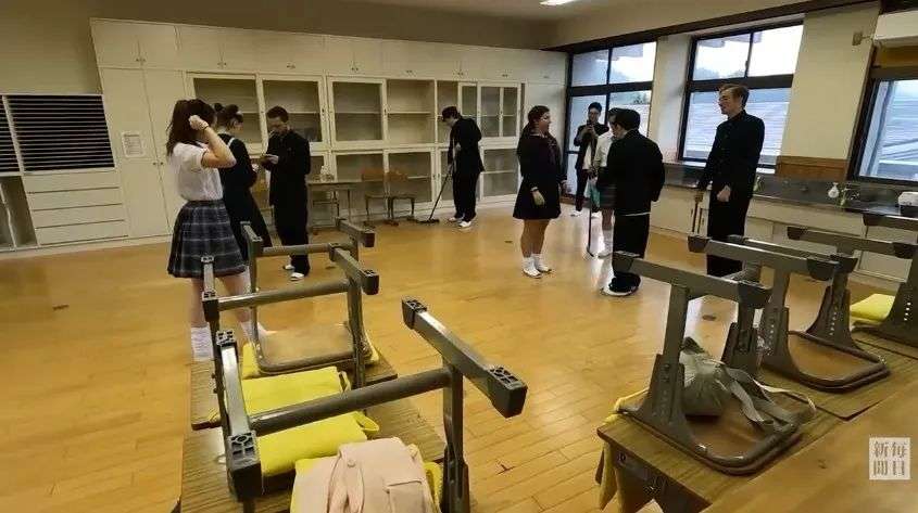 到了打扫时间,外国学生们把课桌椅挪开扫地。